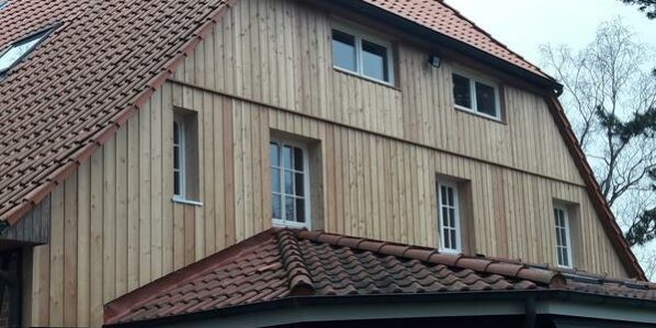 Erneuerung einer Giebelverkleidung mit Boden-Deckelschalung aus Lärche unbehandelt einschl. dahinter liegender neuer Wärmedämmung sowie Ausbau der dahinter liegenden Dachgeschossräume.